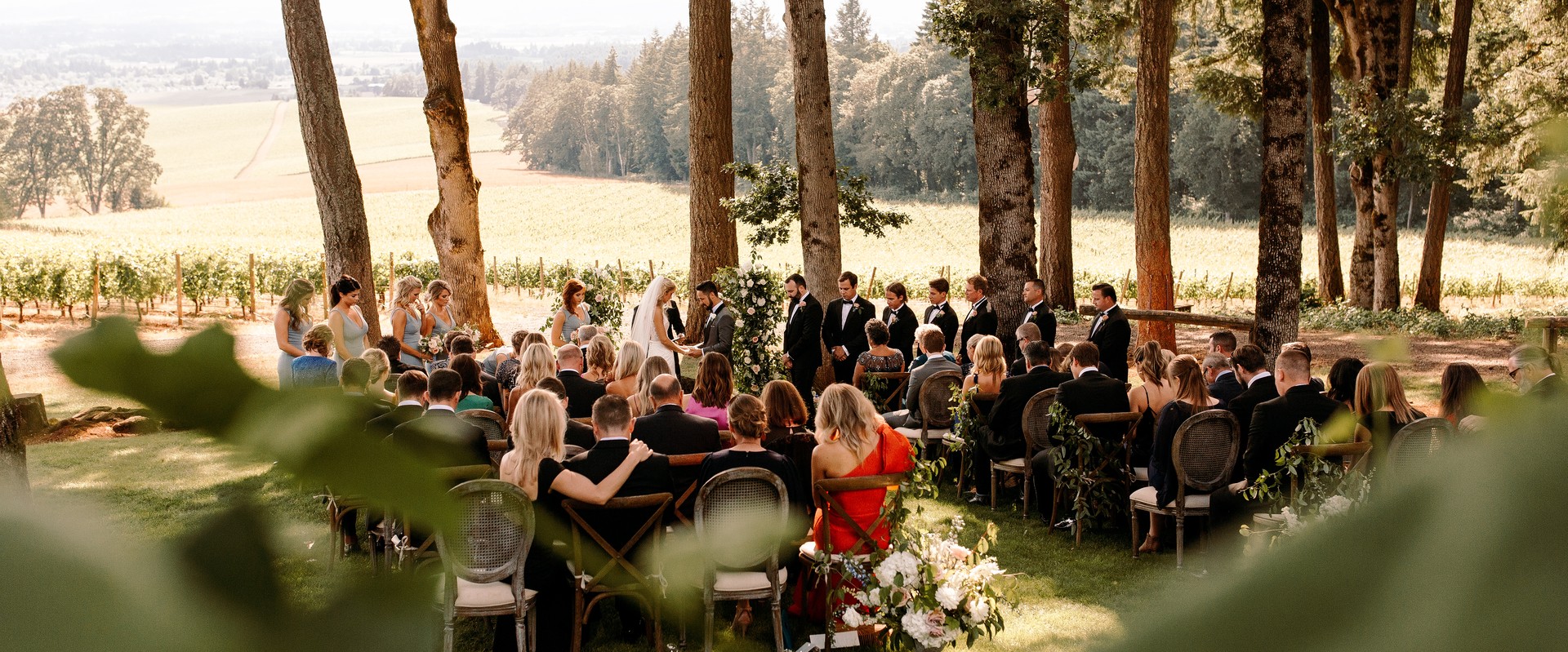 Experience the vineyard wedding of your dreams at Domaine de Broglie. Our ceremony space is surrounded by vines and a grove of oak trees, perched atop the Dundee Hills encompassed by breathtaking views of the Willamette Valley.
